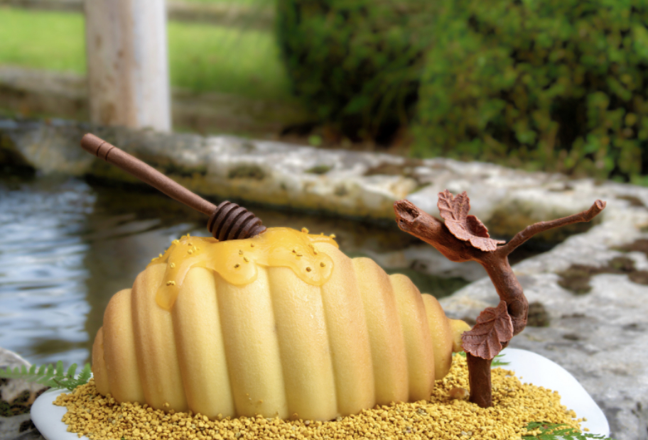 Sous son manteau doré, la ruche bourdonne de surprises bien butinées : croustillant au pollen, biscuit moelleux au miel, confit d’agrumes vibrant et la douceur d’un riz au lait infusé de feuille de citronnier.